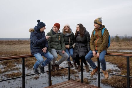 5 people in nature walk and take photos of selfies