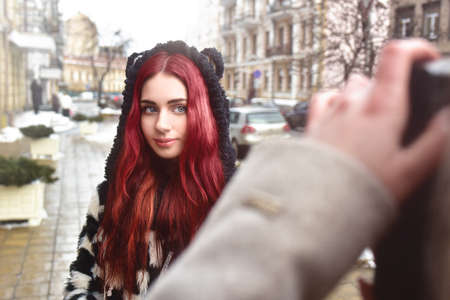 A pretty informal girl with red hair poses and looks at the camera while her friend takes her picture.