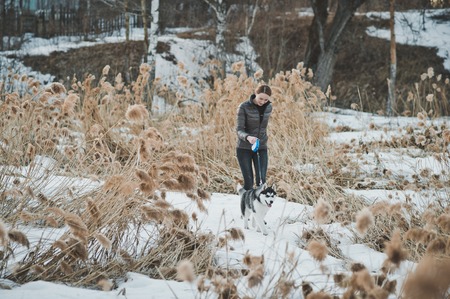 walks outdoors: the girl walks on the winter forest