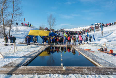 City of Uglich, Yaroslavl region, Russia - 10/02/2018: Place, for swimming competition in icy water, at the festival Winter fun in Uglich, 10.02.2018 in Uglich, Yaroslavl region, Russia.
