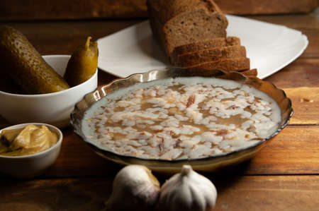 Jellied meat on a brown wooden background.Homemade jelly meat with mustard and horseradish on the table. Holodets
