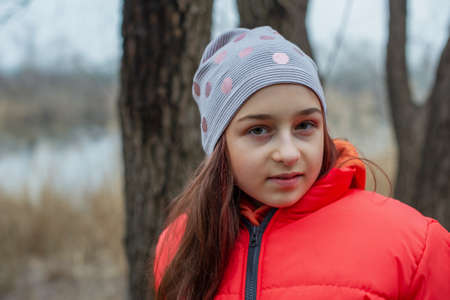 Girl in winter clothes on a background of the river. Girl 10 years old. Teenager in orange jacket