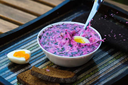 Cold beetroot soup with eggs and bread on a decorative tray.Soup kholodnik red on an unusual tray. Food