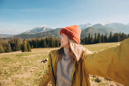 Young woman making selfie photo high in the snow mountains enjoying the view. Freedom, happiness, travel and vacations concept, outdoor activities, she wearing red hat and a yellow jacket
