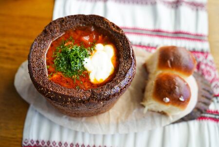 traditional ukrainian dish borscht with sour cream and bread on a wooden table