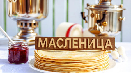 Slavic national festival Maslenitsa or shrovetide. Women in headscarf eat big tasty pancakes, have fun on winter pancake holiday week.