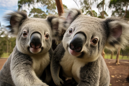 Amusing Group Of Koalas Taking Selfie Photorealism. Concept Wildlife Safari, Majestic Lions, Lush Green Landscapes, Stunning Bird Species, Hidden Waterfall Retreat.