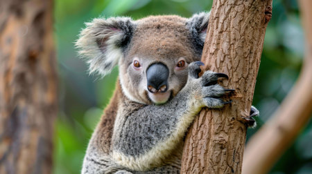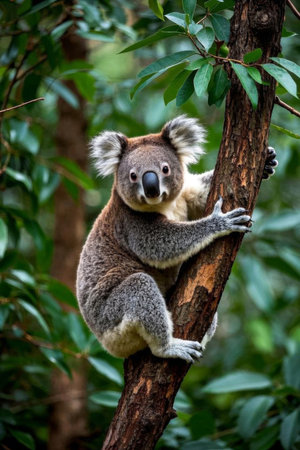 Adorable koala (Phascolarctos cinereus) climbing a tree, showcasing its natural habitat in the Australian wilderness.