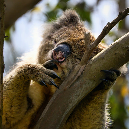Koala in the wild with gum tree on the Great Ocean Road, Australia. Somewhere near Kennet river. Victoria, Australia.