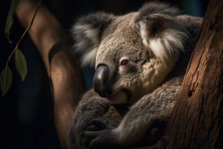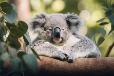 Fluffy koala baby sleeping on tree branch in nature studio generated by artificial intelligence