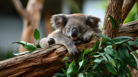 Peaceful Slumber An Australian Koala Finds Rest on a Eucalyptus Branch in a Tranquil Forest