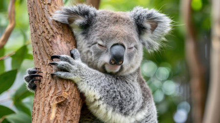 A charming koala bear peacefully rests against a tree trunk surrounded by vibrant greenery. This heartwarming scene captures the essence of wildlife in its natural habitat.