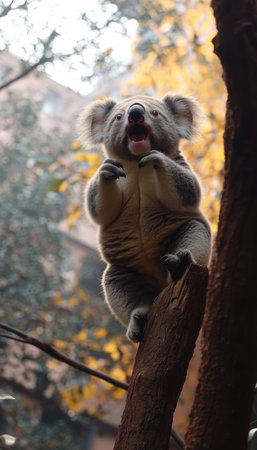 The koala appears energetic as it clings to the branch, surrounded by colorful autumn foliage.