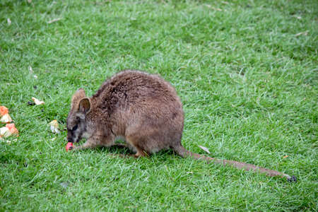 Closeup of side view of wallaby eating in nature. Blurred background.