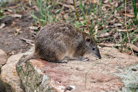 Close up of Australian native animal long-nosed potoroo grazing on forest floor