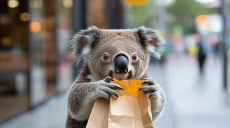 A charming koala with soft grey fur and a distinctive black nose, holding a brown paper bag and appearing to eat from it, with a focused and endearing expression.