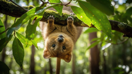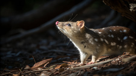 In a tranquil moment, this agile quoll rises to sniff the air, absorbing the rich scents of its Australian habitat. Sunlight filters through the foliage, highlighting its striking fur.