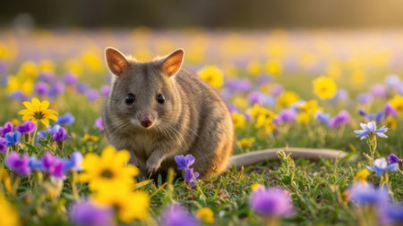 A small mammal explores a meadow filled with delicate flowers under the soft glow of golden hour light. The serene atmosphere captures the essence of nature.