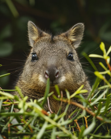 broad-faced potoroo, its large eyes expressing curiosity as it nibbles on native vegetation