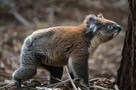 Side view of a koala (Phascolarctos cinereus) in the wild, exploring a woodland environment. Captured in Australia, highlighting its natural behavior and habitat.
