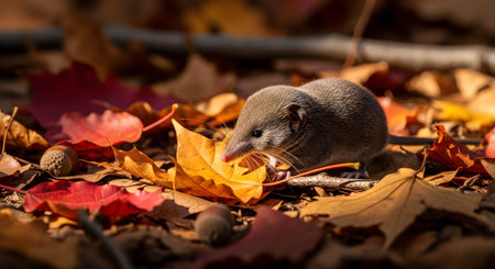 A small shrew or rodent navigates through a layer of fallen red and orange autumn leaves. The soft lighting illuminates its fur and long snout, creating a warm, seasonal atmosphere.