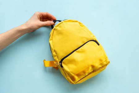 Yellow school backpack. Back to school concept. Top view