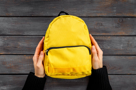 Classic yellow school backpack top view. Educational objects background