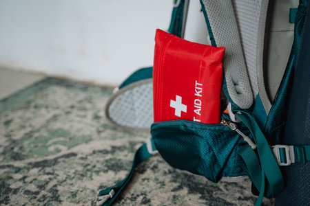 A bright red first aid kit is prominently hanging out of a backpack, indicating it might be ready for immediate use in case of an emergency during outdoor activities or hiking trips