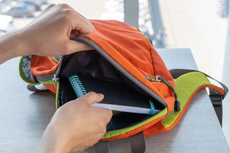 Womens hands take out stationery, books from an open orange school backpack lying on the table. Back to school concept.
