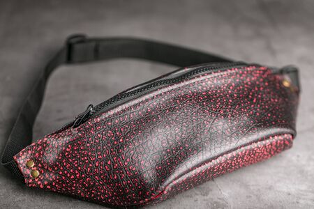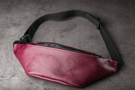 Waist bag made of dark red leather, banana on a gray background. Handmade
