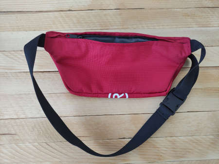 Red waist bag on a wooden background, back view