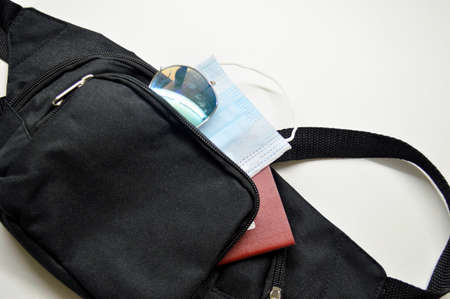 Black belt bag with passport, medical mask and sunglasses on white background.