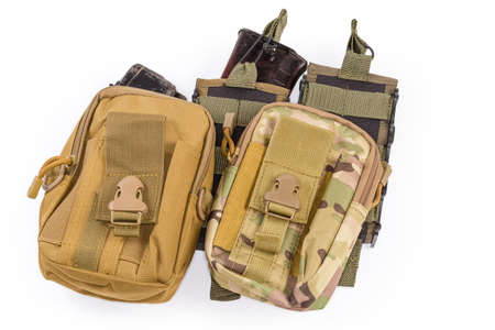 Military tactical pouches for various purposes for fasten to unloading vest or bulletproof vest, cartridge magazines on a white background