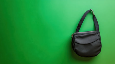 A stylish black messenger bag elegantly placed against a vibrant green background. This versatile accessory is perfect for casual outings, showcasing modern design and practicality.