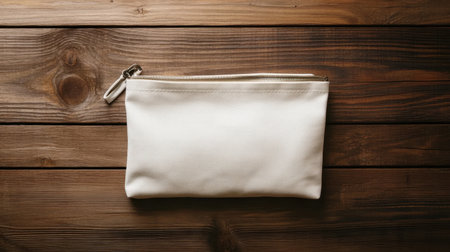 A minimalistic white zippered pouch rests on a wooden surface, providing a stylish and practical solution for organizing everyday accessories and essentials.