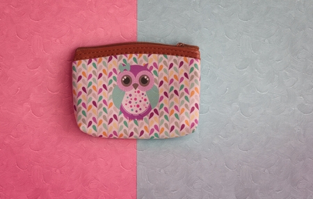 Colorful wallet with image of owl on the blue and pink pastel colored paper background. Flat lay. Minimal concept.