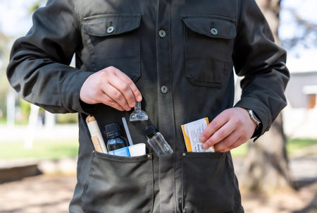 Close-up of male hands holding medicines and pills in bag outdoors