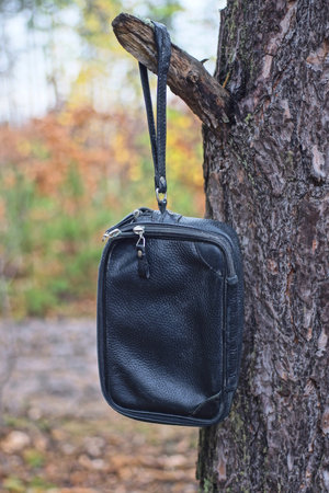 one small black leather bag hanging on a harness on a branch of a gray pine tree in the forest