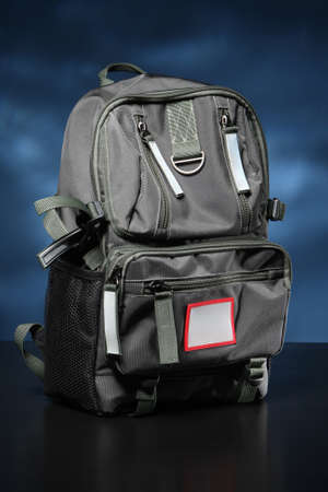Large backpack on a dark background. Black backpack with a lot of kormans. Concept - sale of bags and backpacks. Carrying bag on the back. City bag for carrying on back. Modern Urban Bag
