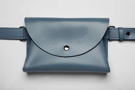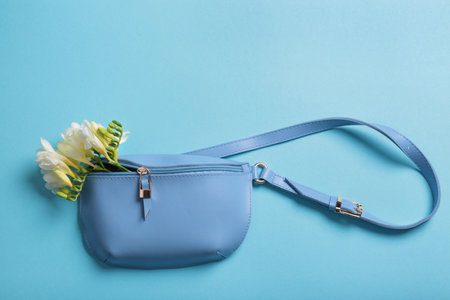 Stylish woman's bag on light background, top view