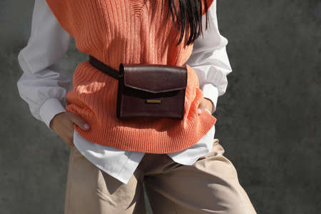 Elegant woman with a fanny pack. Closeup picture