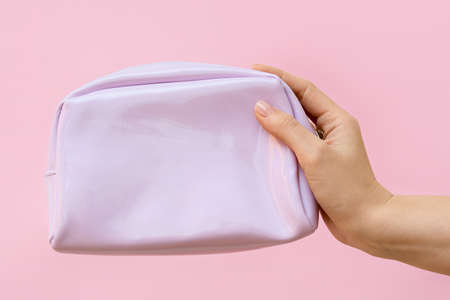 Hand with cosmetic bag on color background
