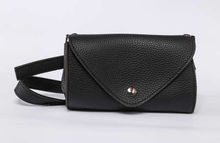 Black leather clutch bag on a strap isolated on a white background