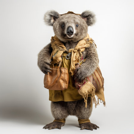 a koala dressed in traditional bavarian attire poses on a white background, with a potato sack placed in front of it. ai generated