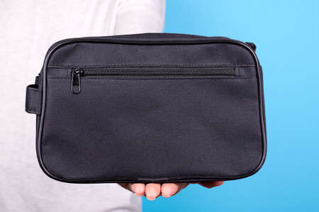 Hand with dark cosmetic bag.