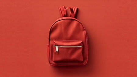 Red school backpack on a red background. Back to school concept.