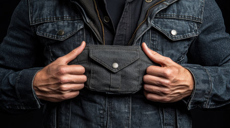 A man proudly presents a distinctive pocket feature on his denim jacket.