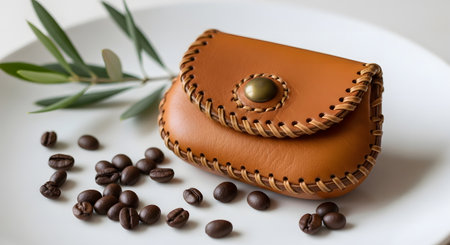 Brown leather purse with coffee beans and olive branch on a white plate