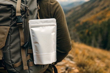 Hiker with a backpack and a pack of coffee on the background of the mountains.