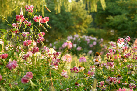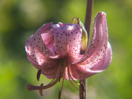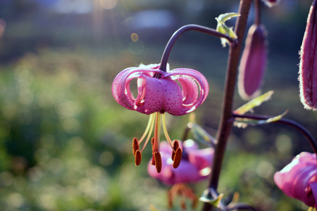Lily martagon, a beautiful forest pink flower illuminated by the morning sun